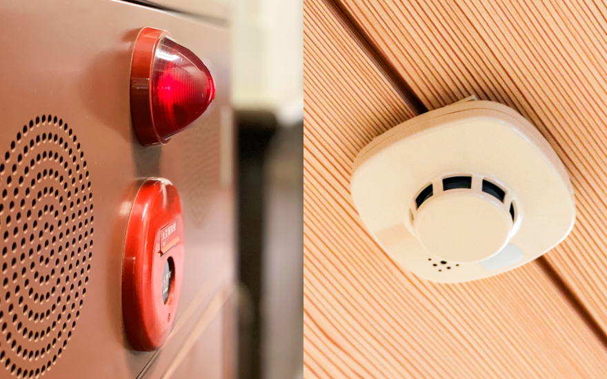 消火器にも設備の構成要素もさまざまですが、火災発生を知らせる警報設備、スプリンクラーなどの消火設備、避難はしごや救助袋といった非難のための設備や、誘導灯なども含まれます。